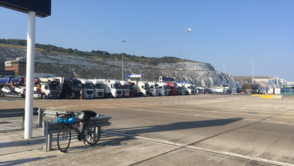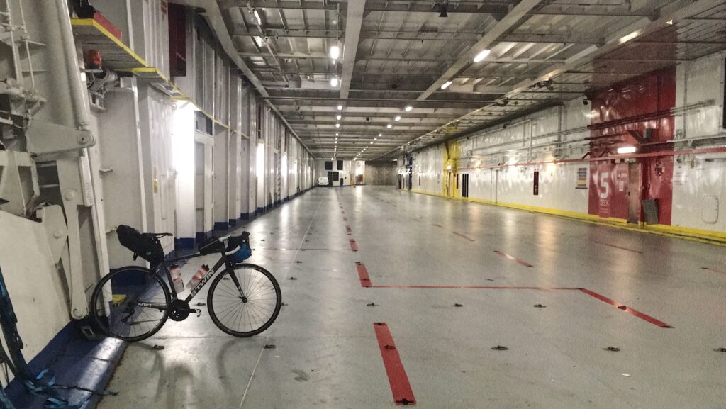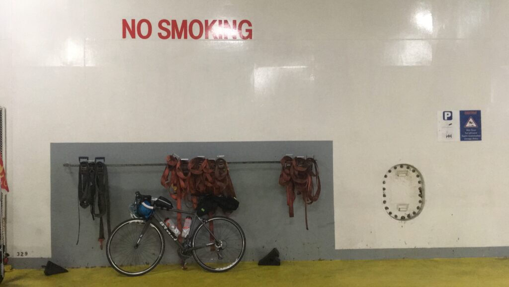 L’Oise et la Seine Maritime traversées me voilà à Dieppe. Le jour est bien là. Un peu en avance pour l’embarquement. Je check et entre dans le bateau. Vélo dans la soute avec les semi-remorques et les voitures.