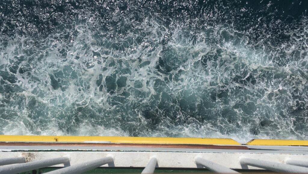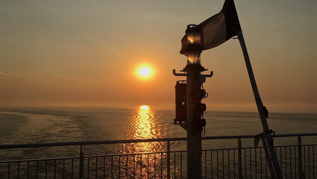D’un coup, sur la fin de l’itinéraire, au sommet d’une petite montée, j’aperçois enfin la mer. Arrivé sur le port quelques instants avant pour prendre le bateau qui me ramènera en France.