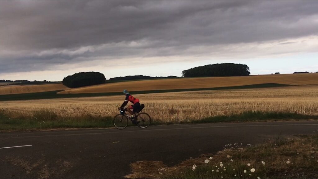 Belle moyenne. Mon vélo est plus léger que pour Cramoisy-Biarritz. La seule différence est à l’arrière. J’ai troqué le porte-bagages et les deux sacoches par un gros sacs de selle. Je somnole un peu. Je sais que je vais pouvoir me reposer bientôt.